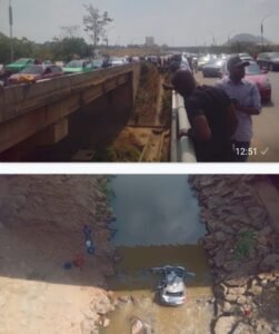 “It happened suddenly. The car lost control, flipped repeatedly and fell under the bridge. People quickly gathered to help the driver,” said Musa Abdullahi, an eyewitness.